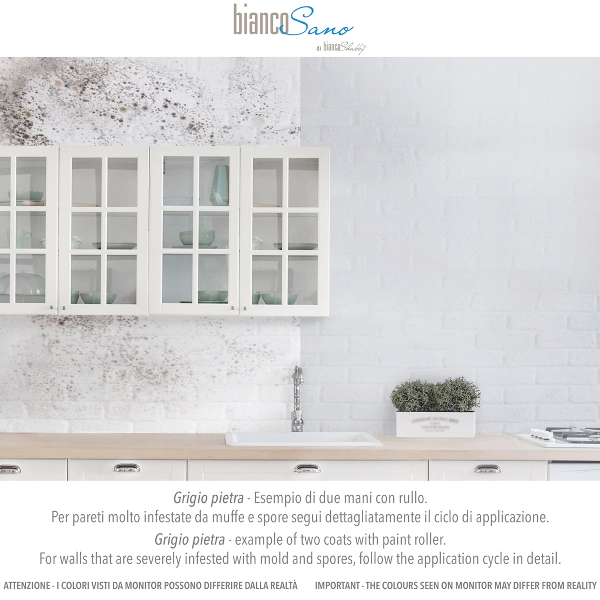- Prima di applicare biancoSano® procedi a sanificare e disinfettare la parete con un prodotto antimuffa a base di ipoclorito di sodio